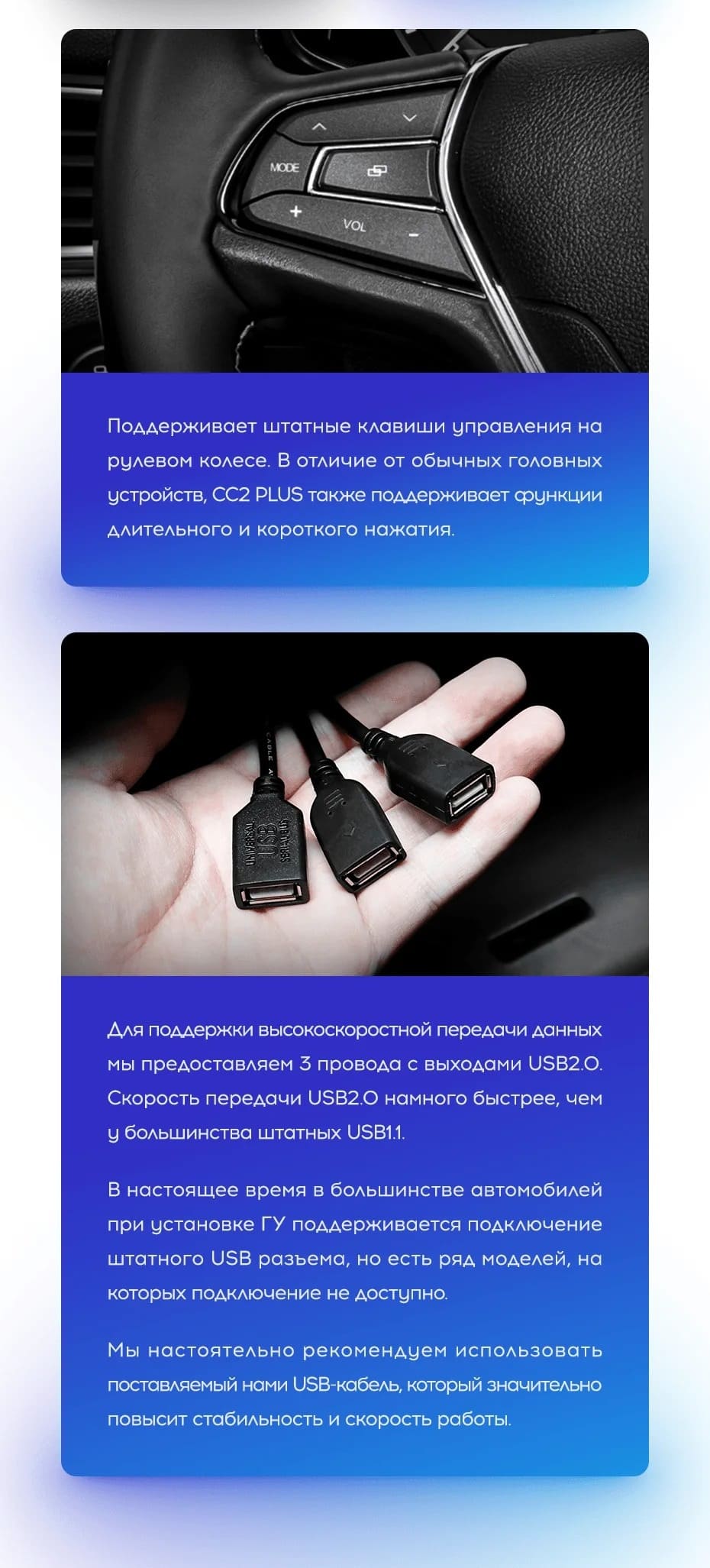 Только в линейке СС3 реализовано программное обеспечение, которое отображает трёхмерную картинку движения автомобиля. Благодаря установленному трёхосному датчику гироскопа на дисплее магнитолы отображается автомобиль в 3D-плоскости (доступны повороты 360о, динамические данные).
