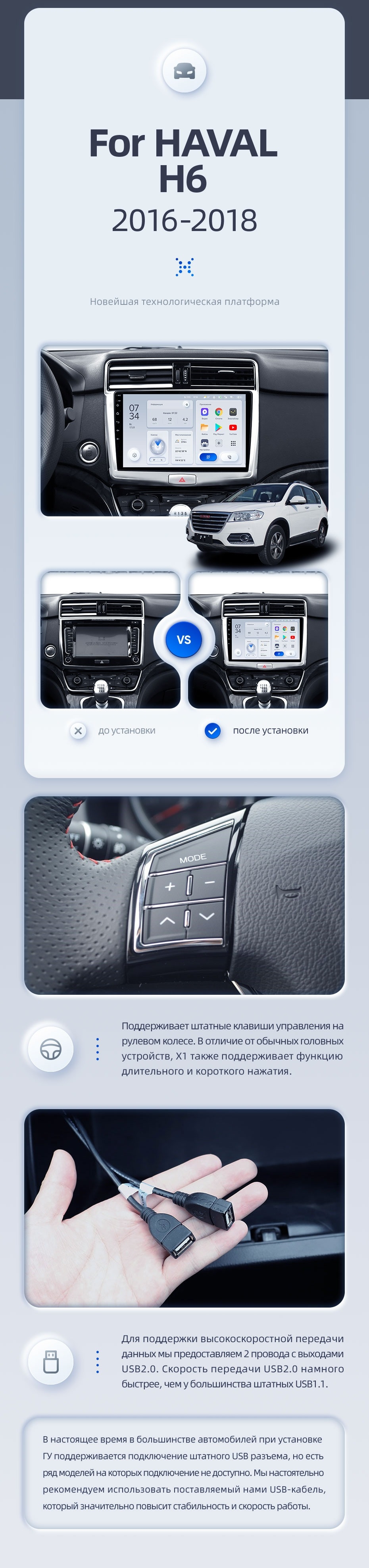 | USB | 3×USB 2.0 + USB 3.0 | Доп. аксессуары | Передняя/задняя AHD-камера, DVR-регистратор, TPMS, парковочный OBD, Type-C → HDMI |