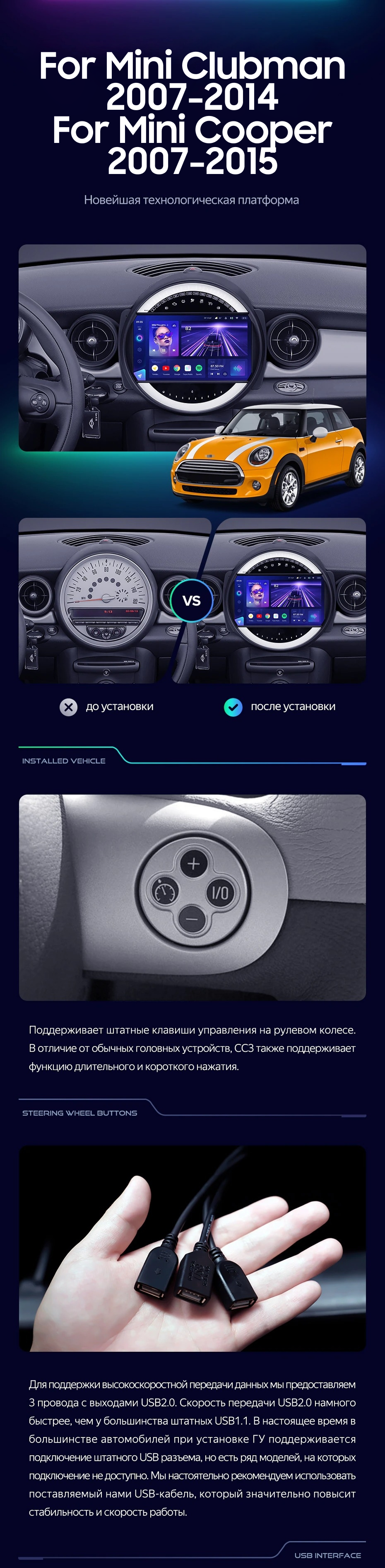 | USB | 3×USB 2.0 + USB 3.0 | Доп. аксессуары | Передняя/задняя AHD-камера, DVR-регистратор, TPMS, парковочный OBD, Type-C → HDMI |