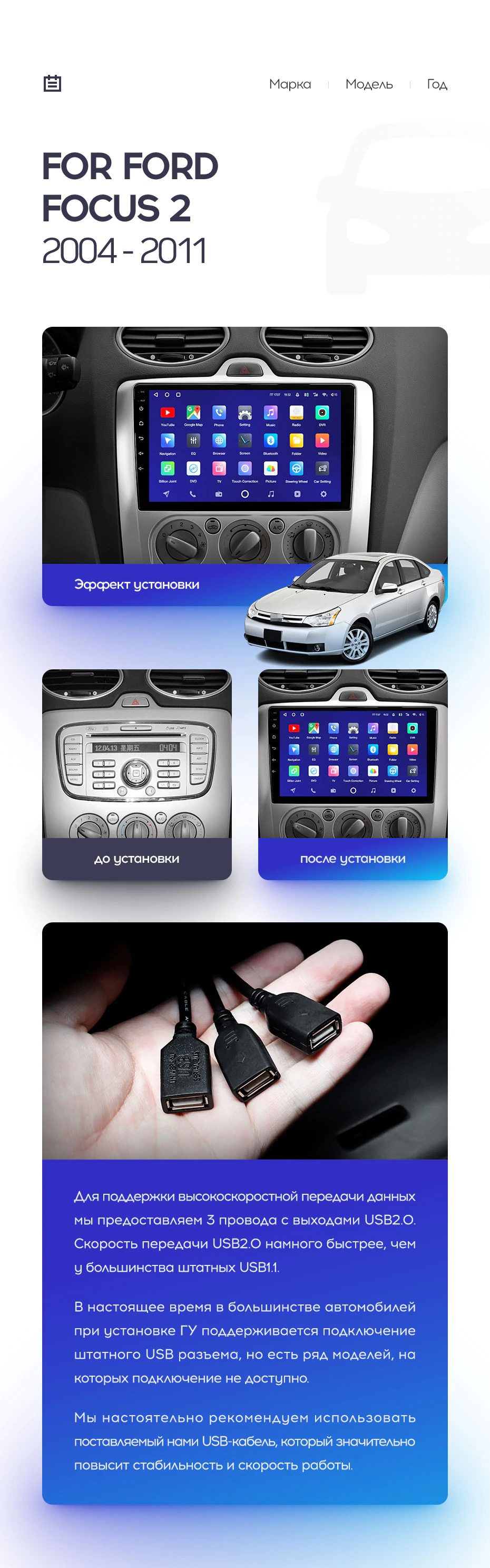 Установочный комплект для Ford Focus 2 Mk 2 (2005-2010) включает переходную рамку и проводку.