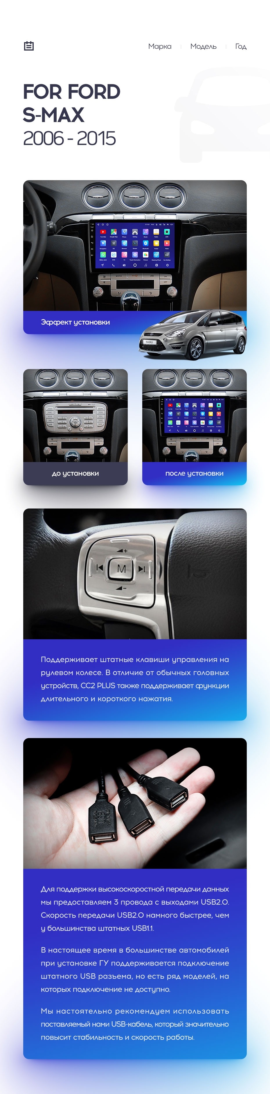 Полный комплект установки магнитолы Teyes с рамкой и проводкой можно выбрать в каталоге штатных магнитол Ford S-MAX (2006-2010).