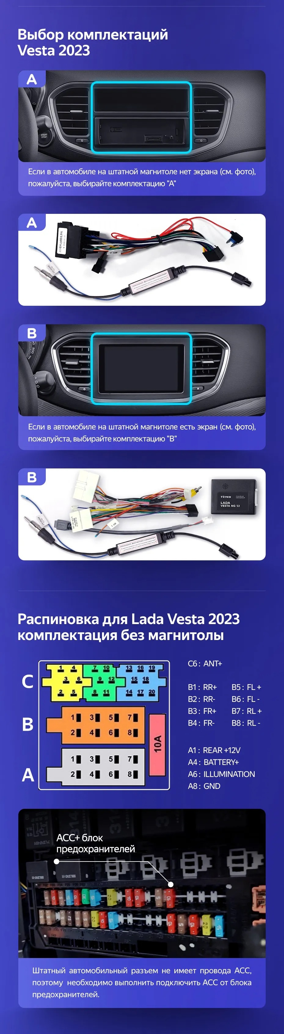 Полный комплект установки магнитолы Teyes с рамкой и проводкой можно выбрать в каталоге штатных магнитол LADA Vesta 2023+.